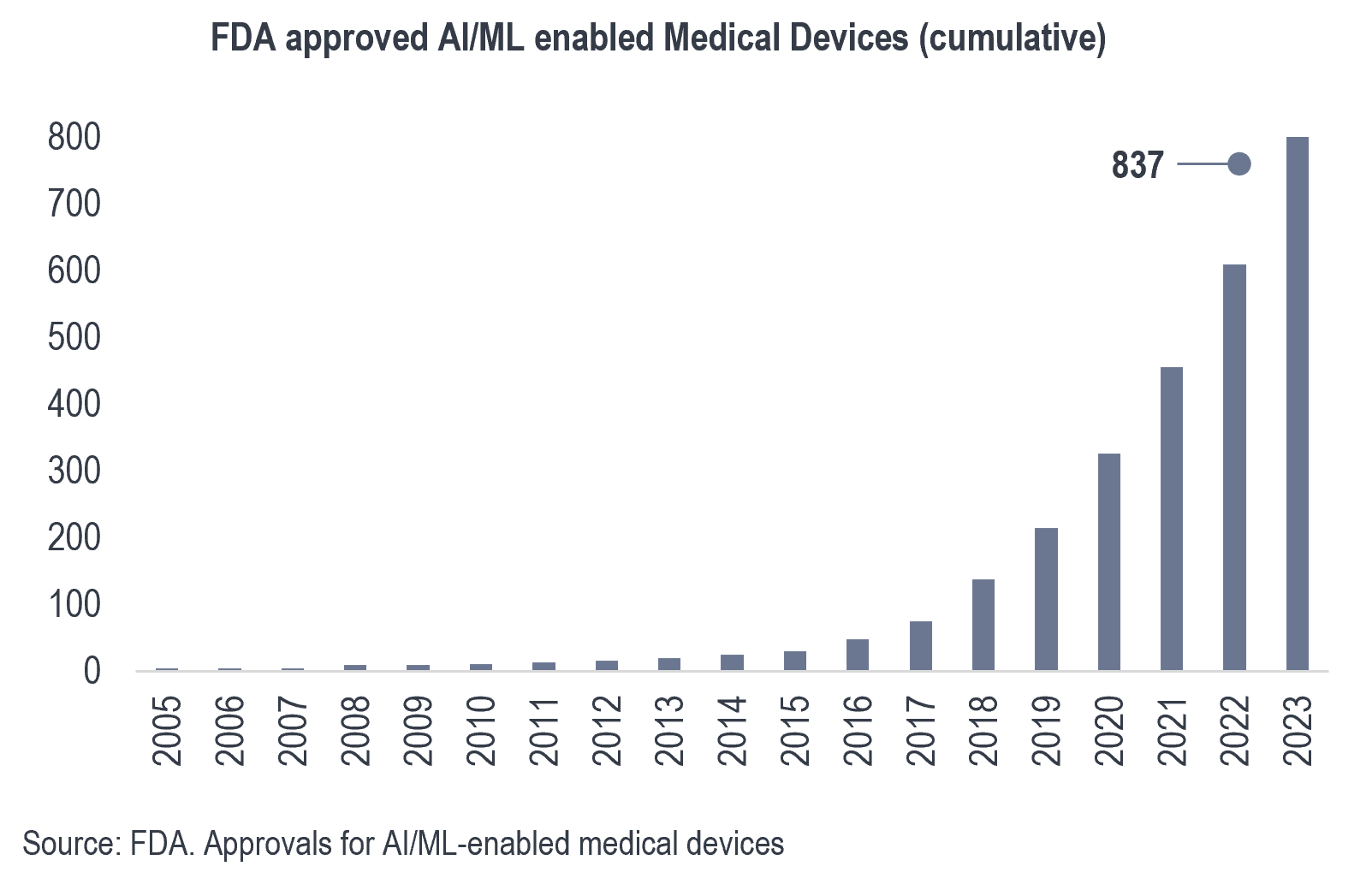 The acceptance for AI/ML medical devices has gained momentum at scale, and international companies are racing to capitalize on the trend. The US market is on the forefront of AI/ML-enabled medical device applications with a cumulative 837 FDA approvals by the end of 2023, with US companies representing 44% of 2023’s approvals. A majority of the devices are seen in the field of radiology, followed by applications in the cardiovascular and neurological fields.