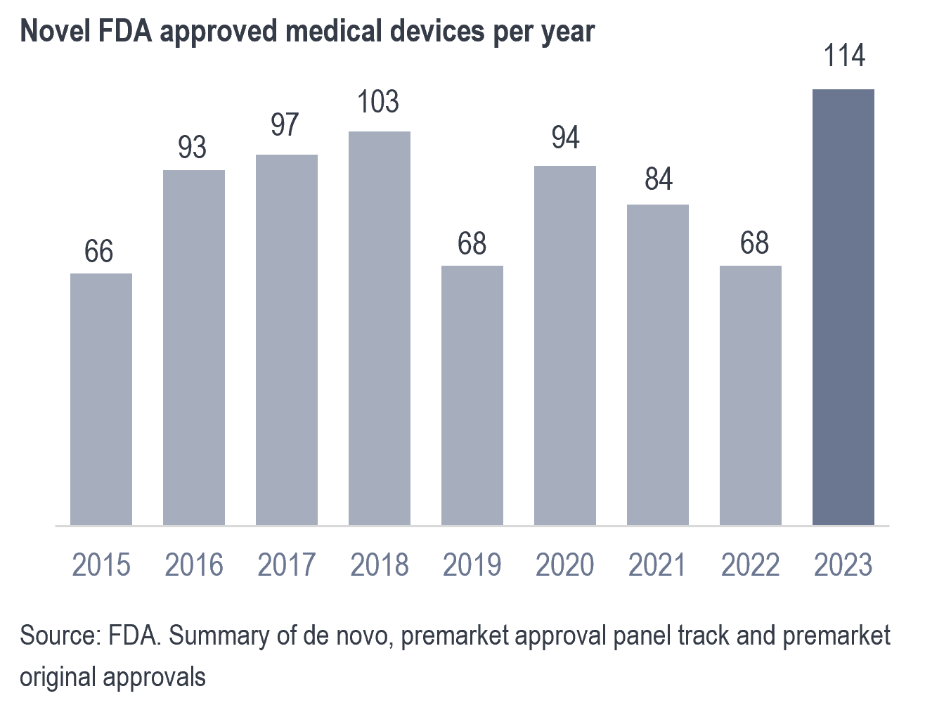 New product development is back again as a top strategic priority for medtech executives following the pandemic years of lower R&D activity and recent focus on major regulatory compliance initiatives, including MDR transition programs that have created capacity constrains. Based on our conversations with executives from medical device companies we now see an increased focus on new product development as companies realize that innovation will remain key to stay competitive. The increased activity level is clearly seen in the increased FDA approvals of medical devices in 2023, partly also explained by more companies shifting focus to US following the stricter regulatory requirements in Europe. A trend that is expected to continue.