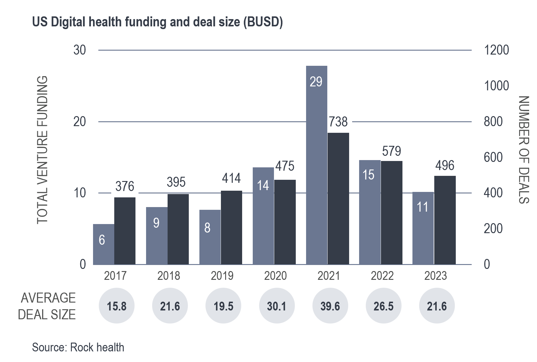 Following the booming market in 2021, we saw a dive in deal activity in the digital health area in 2022 with a continued downhill trajectory in 2023. Half-year in 2024, there are indications of increased interest with higher deal-activity in Q1 although at lower check sizes. Creative financing measures and AI-driven investments are key trends, with 40% of Q1 funding in this area going to AI focused companies. Digital health players need to adapt and align to new paradigms including meaning focus on strong outcomes and healthy margins instead of topline growth.