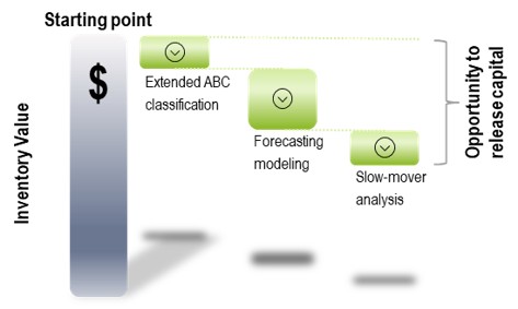 Effective inventory reduction is achieved through targeted analytical tools that differentiate value-adding inventory from excess stock. Inventory optimization leverages tools like demand forecasting, ABC classification, and slow-mover analysis to pinpoint which stock items are essential and identify opportunities for reduction. Strategies like adjusting order quantities and calibrating safety stocks based on lead-time variability can release capital without compromising supply reliability.
