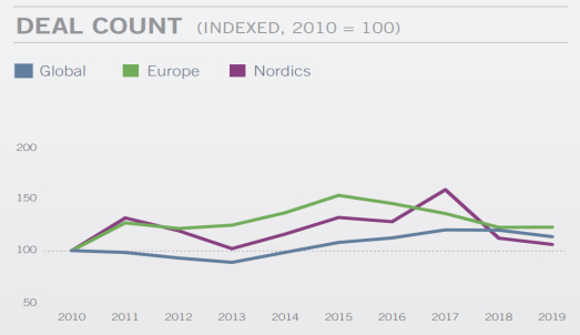 In 2019 Europe maintained its deal count level, while the Nordic region struggled to keep up. Macroeconomic events and uncertainties such as trade wars, Brexit and signs of economic slowdown could explain this decline. The economic downturn could have brought interesting opportunities for dealmakers, who had been piling up cash heading into 2020. However, the start of the year turned out to be challenging for dealmakers as the Coronavirus pandemic further reduced M&A activity.