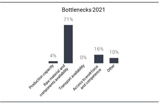 The survey clearly highlights that component shortages continue to be a concern, and that this has been a major driver for increasing costs during 2021. Furthermore, 7 out of 10 companies see access to raw materials and components as the biggest bottleneck during 2021 and 2022.