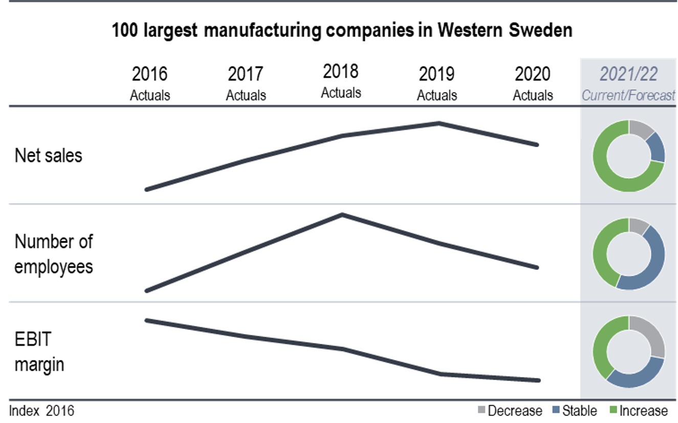 Leaving behind a challenging 2020, the 100 largest manufacturing companies in Western Sweden are optimistic about the future, with 72% predicting increased sales and 90% believing in an increased or unchanged workforce 2022. Of the companies surveyed, 95% see increased or unchanged investment levels for 2022 compared to 2021.