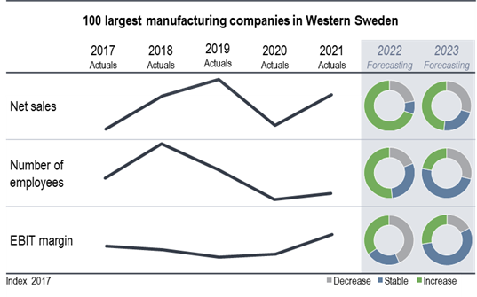 Leaving behind a good 2021 and beginning of 2022, the 100 largest manufacturing companies in Western Sweden are more negative about the future. Revenue is expected to increase in 2022 and in 2023, but margins and headcount are expected to decrease compared to 2021. Uncertainties are clearly high considering the expected cost and price increases.