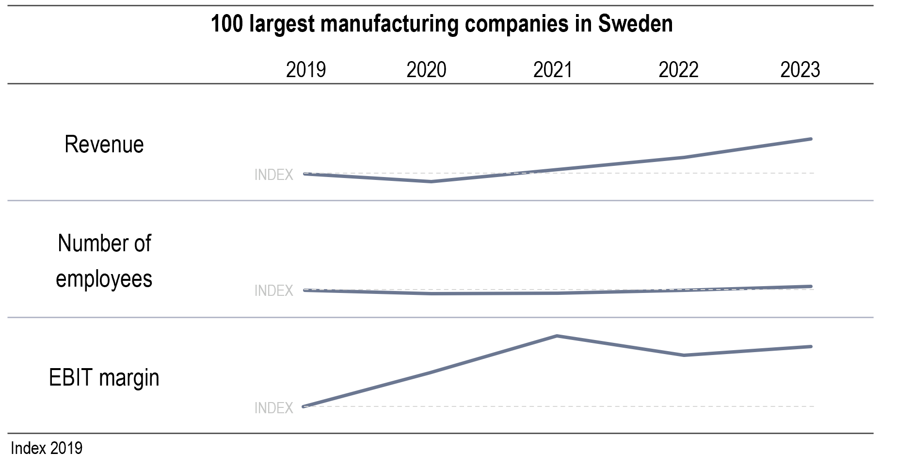 The Industrial Report surveys the 100 largest Swedish manufacturing companies, providing a forecast for the sector. It highlights expected revenue, operating margins, and workforce, compiled into the Triathlon Manufacturing Index. Additionally, the report uses data from company annual reports for a deeper analysis of industry trends.